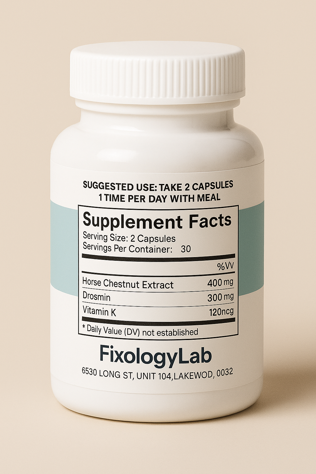 FixologyLab™ Varicose Vein Vanisher is a powerful, plant-based supplement designed to relieve the appearance of varicose and spider veins. With 400mg of Horse Chestnut Extract and 300mg of Diosmin, this formula promotes healthy vein tone, strengthens blood vessel walls, and improves lower limb circulation. Combined with Vitamin K, it targets vein weakness at the root—delivering noticeable results in comfort, swelling, and skin clarity over time.